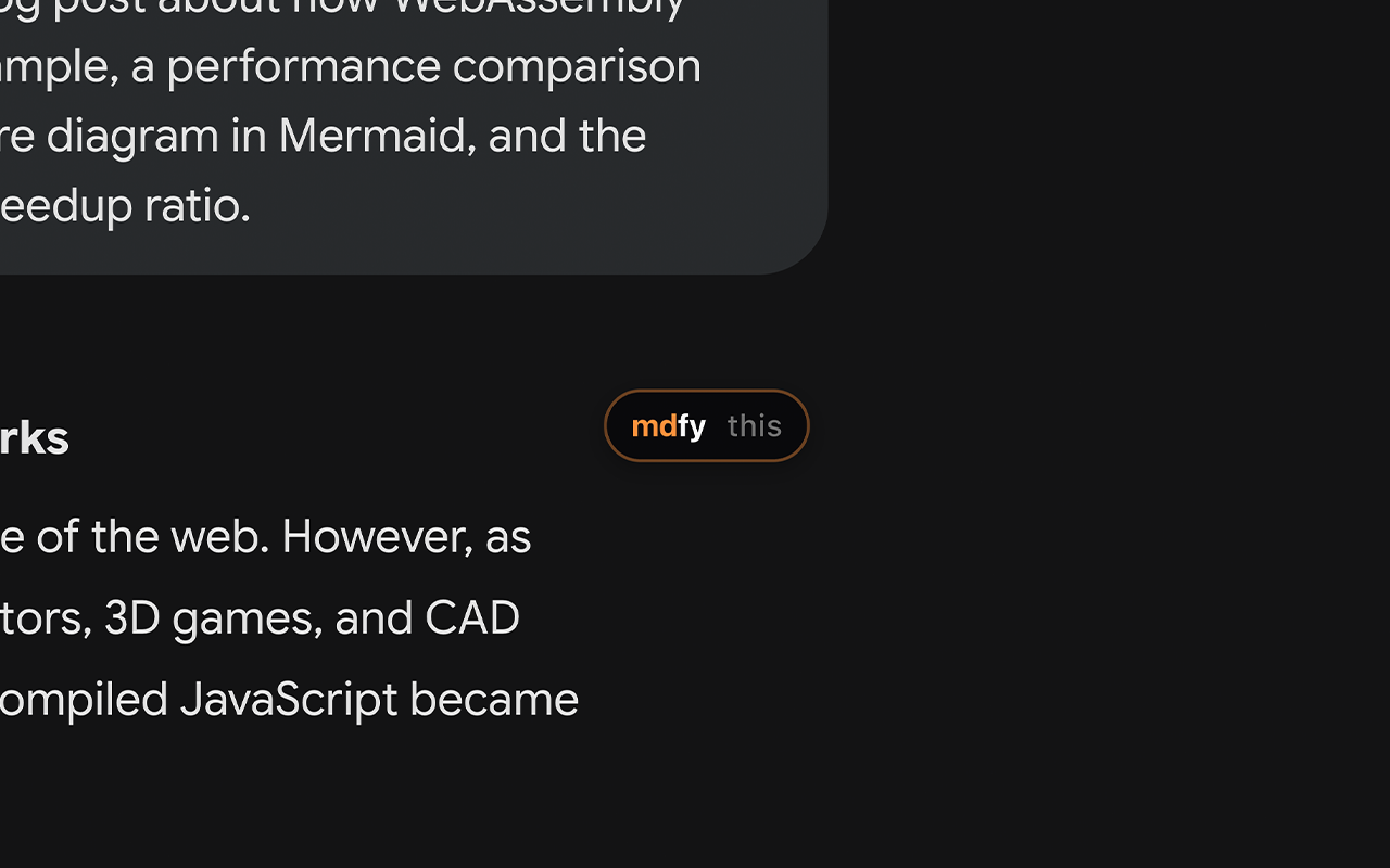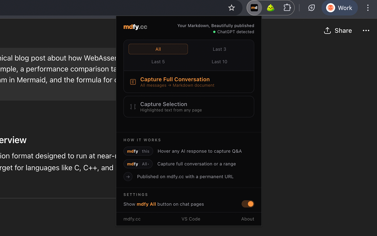좋은 AI 응답 발견 → mdfy 버튼 클릭 → 깔끔한 URL 자동 생성 → 누구에게든 전송