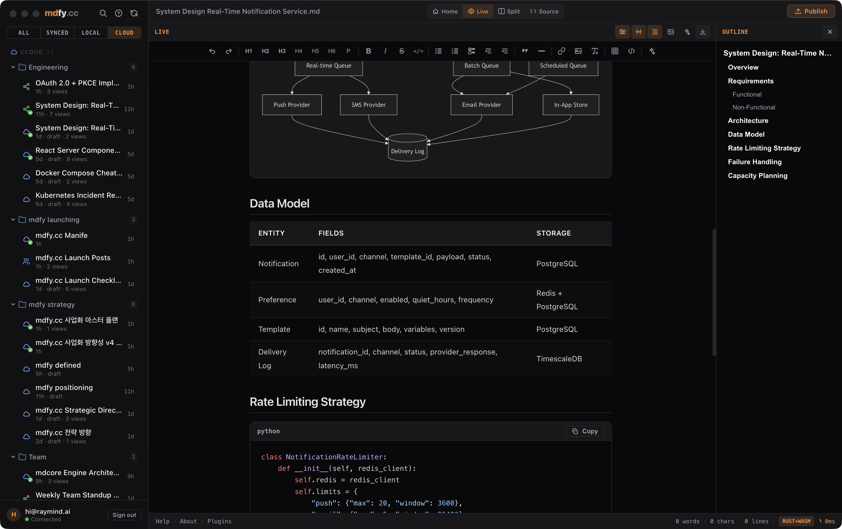 파일 선택 → Space 누르기 → 코드, 수식, 다이어그램까지 완전 렌더링 → "Open in mdfy.cc" 클릭으로 편집
