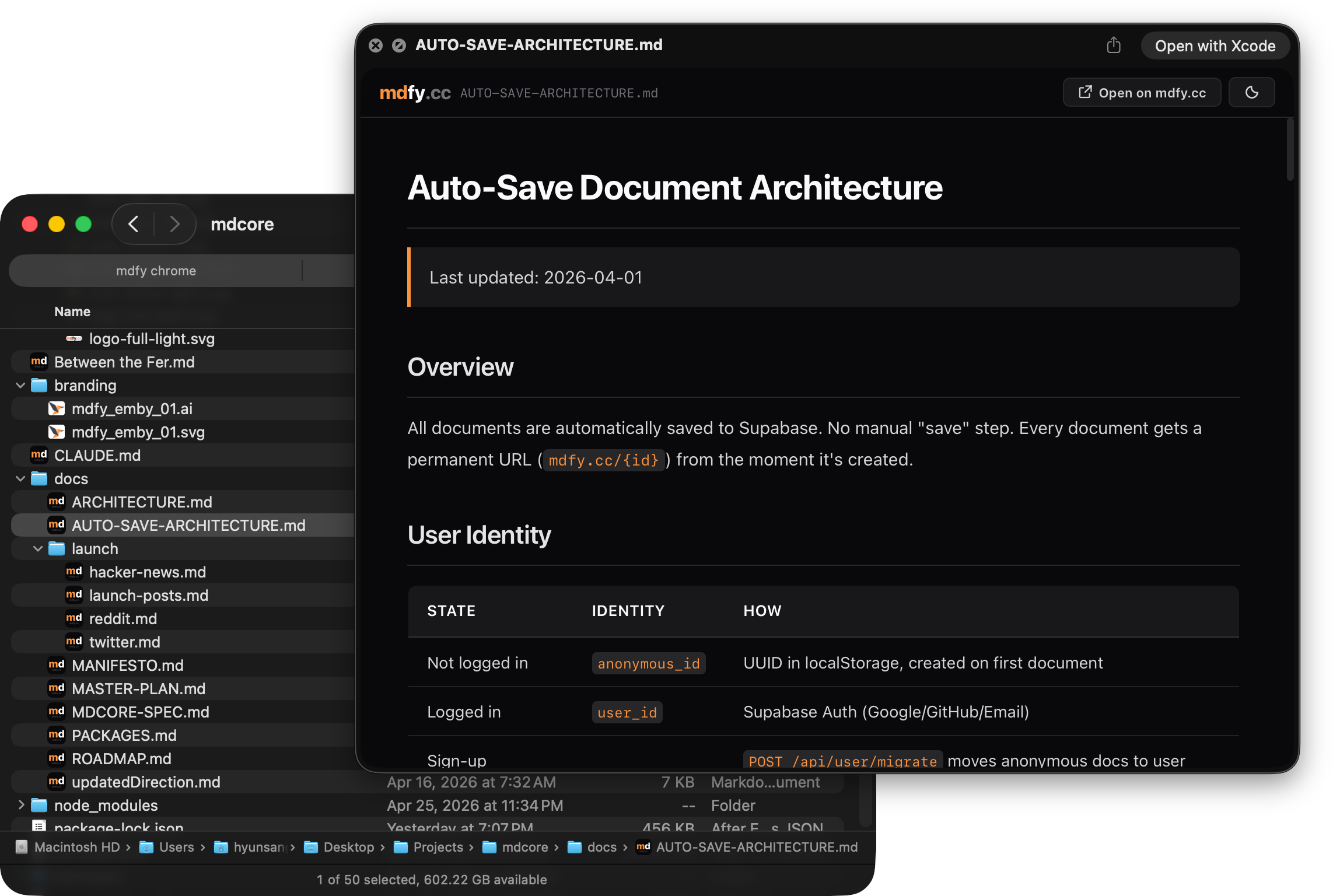 어떤 AI에서든 캡처하고, Finder에서 미리보고, 에디터에서 퍼블리시하세요. 모든 문서는 영구 URL을 가지며 — 편집, 버전 관리, 모든 플랫폼에서 사람과 AI가 읽을 수 있습니다.