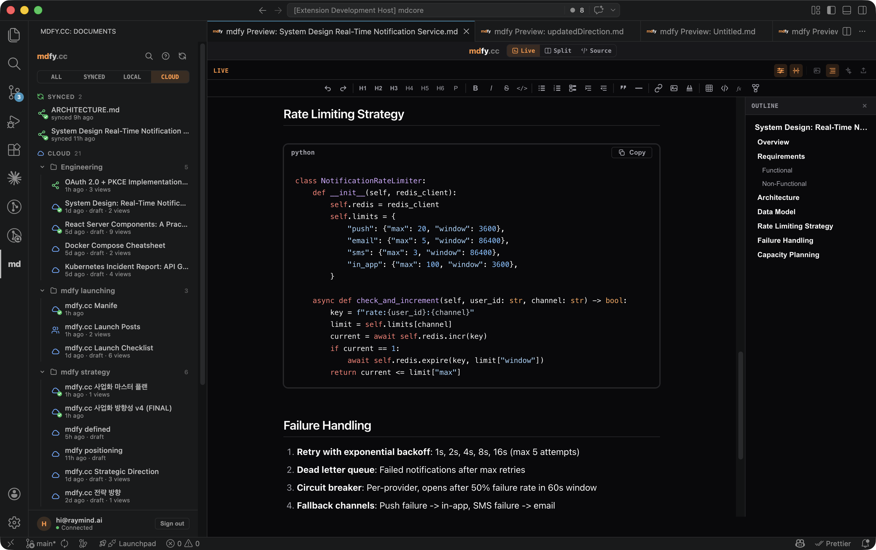 VS Code에서 작성 → Cmd+Shift+M 미리보기 → 한 번의 명령으로 퍼블리시 → 팀에 URL 공유